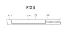 次に、第3の実施形態の医療デバイス60について説明する。第1の実施形態の医療デバイス10と共通の構成については、同じ符号を付し、説明を省略する。図8に示すように、本実施形態の医療デバイス60は、長さ方向の全体が伸縮部である電極部61を有している。電極部61は、弾性的に伸縮可能な材料、例えばゴムで形成されている。ただし、伸縮可能な樹脂などその他の材料で形成されていてもよい。電極部61は、基端部がシャフト部21に、先端部が先端固定部材45に、それぞれ固定されている。  Next, a
