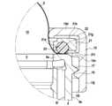 ワッシャ21は、環状上面21eおよび環状下面21iを含み、環状凹部22の内側において固定リング15内で固定される。環状凹部22は、環状上壁15dの内側面と、スカート部15jの内側面15iから突出したリブ15nと、によって規定される。凹部22は、C形状領域を呈する。ワッシャ21が横方向に移動する自由は、一方側では、環状上面21eが接触し得る環状上壁15dの下面によって、他方側では、環状下面21iが接触し得るリブ15nによって、制限される。ワッシャ21が半径方向に移動する自由は、スカート部15jの内側面15iによって制限される。リブ15nは、螺子立て部16によって構成されていてもよいことに留意されたい。ワッシャ21および固定リング15は、ワッシャの対称軸についての互いの旋回が自由な状態で、接続される。  The