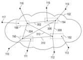 図3は、一実施形態に係る、複数のエンドポイント・グループを有するネットワークを示す。エンドポイント・グループ150~156がネットワーク性能評価を生成するために用いられる。例によっては、代表エンドポイントが各エンドポイント・グループから選択され得る。例えば、エンドポイント110がエンドポイント・グループ150から選択され得、エンドポイント112がエンドポイント・グループ152から選択され得、エンドポイント114がエンドポイント・グループ154から選択され得、エンドポイント116がエンドポイント・グループ156から選択され得る。例によっては、プローブ・トラフィック302~312などのプローブ・トラフィックが、各々の選択された代表エンドポイント間において送信され得る。これは、プローブ・トラフィックをエンドポイント110~117の各ペアの間で送ることを必要とすることなくネットワーク性能評価が生成されることを可能にする。グループ内のエンドポイント間でプローブ・トラフィックの送信元または受け手を分配することによって、グループ内の全てのエンドポイントを用いることも可能である。  FIG. 3 illustrates a network with multiple endpoint groups, according to one embodiment. Endpoint groups 150-156 are used to generate network performance assessments. In some examples, representative endpoints may be selected from each endpoint group. For example,