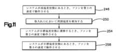 図9および図11を参照しながら、ファン192を動作させる方法をここで説明する。レセプタクル154が高温度ETにされ、その高温度ETで維持されているとき(図13における初期時間t0~第2の時間t2)、ステップ246において、コントローラ46は、第1の速度S1で動作するようファンに指示することができる。第1の速度は、アイドル速度または低速と呼ぶこともできる。第1の速度S1がゼロより大きい実施形態では、空気は第1の速度S1で、プレナム100の空気導管120に強制的に通され、レセプタクル154に沿って流される。ゼロより大きい第1の速度S1でファン192を動作させることは、プレナム100を通って流れる空気に過剰な熱を伝え、したがってハウジング14の空気排出口42から流出する空気とともに、過剰な熱の少なくとも一部を除去するように機能することができる。これにより、システム内の構成要素が過熱するのを防止することができ、空気の周囲温度を測定する、ファン192に隣接した温度センサ194が、ヒータ186により熱が生じた結果として偏った測定値を提示することを、防止することができる。A method of operating