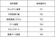 端末識別子は、システム管理者等により定められる識別情報である。サーバ装置20は、図3に示すようなテーブル情報により端末識別子と対応する端末の種類を管理する。各端末には、対応する端末識別子が登録(入力)される。同じ種類の複数の端末がシステムに含まれる場合には、同じ端末識別子が割り当てられる。例えば、複数のチェックイン端末10がシステムに含まれる場合には、各チェックイン端末10に「T01」が登録される。  A terminal identifier is identification information determined by a system administrator or the like. The