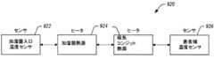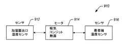 各種のセンサは、上流又は下流の温度センサとすることができる。センサとしては、加湿器出口温度センサ、加湿器入口温度センサ、及び/又は患者端温度センサを含めることができる。各種のヒータは、能動プロセスのために加熱できる。ヒータとしては、加湿器熱源及び/又は吸気コンジット熱源を含めることができる。図9Aに示されるように、能動プロセスは、上流センサ912として加湿器出口温度センサ、ヒータ914として吸気コンジットヒータ、及び下流センサ916として患者端温度センサを含む組合せ910を利用できる。加湿器熱源は、動作停止させることができる。図9Bに示されるように、能動プロセスは、上流センサ922として加湿器入口温度センサ、ヒータ924として加湿器熱源と吸気コンジット熱源、及び下流センサ926として患者端温度センサを含む組合せ920を利用できる。図9Cに示されるように、能動プロセスは、上流センサ932として加湿器入口温度センサ、ヒータ934として加湿器熱源、及び下流センサ936として加湿器出口温度センサを含む組合せ930を利用できる。吸気コンジット熱源は、動作停止させることができる。  Various sensors can be upstream or downstream temperature sensors. The sensors may include humidifier outlet temperature sensors, humidifier inlet temperature sensors, and/or patient end temperature sensors. Various heaters can heat for active processes. Heaters may include humidifier heat sources and/or intake conduit heat sources. As shown in FIG. 9A, an active process can utilize a