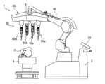 また、ポジショナ40には、ポジショナ40の複数の関節部43に対応するように、複数のサーボモータM4と、エンコーダE4と、減速機(図示せず)とが設けられている。エンコーダE4は、サーボモータM4の回転角を検出するように構成されている。減速機は、サーボモータM4の回転を減速させてトルクを増大させるように構成されている。  Further, the