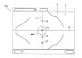 具体的には、表示部33aには、予め、略円形状の第1印部MK1と、十字線形状の第2印部MK2とが表示されている。そして、表示部33aには、第1印部MK1と第2印部MK2とにオーバラップするように、撮影部51に撮影された患者Pの体表面Sが表示される。  Specifically, a substantially circular first marking portion MK1 and a cross-shaped second marking portion MK2 are displayed in advance on the