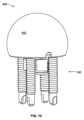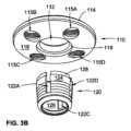 複数の可撓性アーム140A~140Dは、円筒形部分132の下面136(図4B)から延びる。複数の可撓性アーム140A~140Dの各々は、内向きテーパー内面と、反対側外面とを含む。例えば、第1の可撓性アーム140Aは、テ内向きーパー内面142Aと、外側湾曲部分144Aと、外側平坦部分146Aとを含み、第3の可撓性アーム144Cは、内向きテーパー内面142Cと、外側湾曲部分144Cと、外側平坦部分146Cとを含む。外側湾曲部分144Aは、可撓性アーム140Aが、円筒形部分132の内側ねじ切りボア138を通る中心軸に対して半径方向外向きに移動または可撓性となることを補助する。本明細書でさらに詳細に説明するように、可撓性アーム140Aの撓みの動きによって、外側平坦部分146Aの少なくとも一部が複数のフィン150A~150Dの対応する1つの少なくとも一部と接触し、それにより、フィンを第1の略内側位置から第2の略外側位置に向かって移動させる。  A plurality of