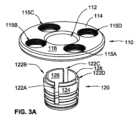 プレート114は、略円筒形またはディスク形状を有し、上面116(図3A)と、下面118(図3B)とを含む。また、プレート114は、上面116(図3A)から下面118(図3B)に延びる複数の開口115A~115Dを含む。示されるように、複数の開口115A~115Dは、本体110の中央開口112の周りに同心円状に配置されている。複数の開口115A~115Dの各々は、任意でねじ切りされ、関節窩インプラント100の患者の肩甲骨への固定を補助ために、留め具170A~170D(図1A~2)の少なくとも一部をその中に収納されるような略サイズおよび形状である。