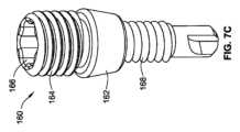 図7Cを参照すると、いくつかの実装では、プラグ160は、先端部分162から延びる留め具部分168を任意で含む。留め具部分168は、先端部分162と単一および/または一体であるか、あるいは、(例えば、溶接接続を介して、プラグ160の内側ねじ切りボアへのねじ接続を介して、または、その双方で)先端部分162に連結され得る。留め具部分168は、以下に説明する留め具170A(図8)と同一か類似しているが、ヘッド172Aを除いている。関節窩インプラント100の組み立てられた構成では(図1A~1B)、留め具部分168は、コレット130の内側ねじ切りボア138を通って延在し、一般に、本明細書に記載の複数の留め具170A~170Dと同一または同様の方法で患者の骨(例えば、肩甲骨の一部)に係合するために使用され、関節窩インプラント100の患者の肩甲骨への固定を補助する。すなわち、プラグ160の留め具部分168は、関節窩インプラント100の中央に固定するために使用することができる。  Referring to FIG. 7C, in some implementations plug 160 optionally includes a