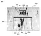 図8は、第2撮像装置200によりスパイク練習の開始直前のコートが撮像された第2入力画像800を示す。図8に示すように、第2入力画像800では、5人の選手が手前側のコート内に集まっており、領域612内で5つの人物領域801~805が検出されている。さらに、第2入力画像800では、4人の選手が奥側のコート内に集まっており、領域614内で4つの人物領域806~809が検出されている。仮にスパイク練習、第2撮像装置200及び手前側のコート領域に関連付けられた特徴情報として「人物領域が4つ以上であること」及び「各人物領域の水平及び垂直方向の重心位置の標準偏差がそれぞれ一列に対応する設定範囲内であること」が設定されているものとする。また、スパイク練習、第2撮像装置200及び奥側のコート領域に関連付けられた特徴情報として「人物領域が2つ以上であること」が設定されているものとする。その場合、第2入力画像800に対するスパイク練習の適合度合いは高くなり、第2入力画像800からイベントとしてスパイク練習が特定される。  FIG. 8 shows a