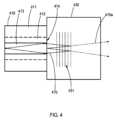 或る実施形態では、体積ブラッググレーティングが、以上に論じられているやり方でフィードバックを提供するために、図4に示されている様に一片のガラスエンドキャップの中に書き込まれている(例えば、コア、クラッディング、又はそれら両方のレーザー変質区域を作り出すことによって形成されている)。かくして、この実施形態は、外側クラッディング411と、内側クラッディング412と、コア413と、を有する光ファイバー区分410を有している。光ファイバーの面414は、光学部材430、例えばガラスエンドキャップ、に機械的及び光学的に接触しており、例えば光学部材430へ融合されている。VGB431が部材430中に刻まれている。光(矢印によって図示)は、VBG431に入射及び出射結合され(矢印470)、そこから伝播される(矢印470a)。かくして、図4の構成はファイバーレーザー共振器の一端又は両端を形成することができる。  In one embodiment, a volume Bragg grating is written into a piece of glass endcap as shown in FIG. 4 to provide feedback in the manner discussed above (e.g., (formed by creating a laser-altered zone in the core, the cladding, or both). Thus, this embodiment has an
