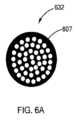 図6及び図6Aに示されている実施形態は、「モスアイ」レーザービーム送達パターンの様な互い違い又は分散パターンであり、光ファイバー端部へ直接に送達されて、モスアイパターンレーザー変質領域を作り出すことができ、また以上に論じられているやり方でのフィードバック例えば反射を提供すること、更には実施形態ではレーザービームの伝播を提供することができる。かくして、図6を見ると、レーザーのレーザー共振器のための反射部材600の或る実施形態の断面概略図が示されている。反射部材600は、コア603と、内側クラッディング604と、外側クラッディング605と、を有する光ファイバー602を有している。レーザー作用帯630は、ファイバー602の端部に設置されている。また、この実施形態では、ファイバー面607に。実施形態では、ファイバー602内部の他の点に配置されることもあり得るものと理解しておきたい。図6Aを見ると、モスアイパターン631を示すファイバー面607の平面概略図が示されている。  The embodiments shown in FIGS. 6 and 6A are staggered or divergent patterns, such as the "moth-eye" laser beam delivery pattern, which can be delivered directly to the end of an optical fiber to create a moth-eye pattern laser-altered region. It can also provide feedback, such as reflection, in the manner discussed above and, in embodiments, laser beam propagation. Thus, turning to FIG. 6, there is shown a cross-sectional schematic diagram of an embodiment of a