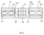 或る実施形態では、図3に示されている様に、光ファイバーの、ファイバーブラッググレーティングが光ファイバー中に直接書き込まれている区分の場所に、更に体積ブラッググレーティング(VBG)が使用されている。かくして、この実施形態は、外側クラッディング311と、内側クラッディング312と、コア313と、を有する第1の光ファイバー区分310を有している。レンズ、即ちレンズ320の組立体が、光路内でファイバー310とVGB331が刻まれた光学部材330との間に配置されている。レンズ321が、VGB331と、外側クラッディング341、内側クラッディング342、及びコア343を有する第2の光ファイバー区分340との間に配置されている。光(矢印によって図示)は、適切なレンズ320でVBG331に入射結合され(矢印370aの順方向及び反射)、適切なレンズ321でVBD331に出射結合される(矢印370b、レーザー伝播)。入射光及び出射光は、ファイバー結合装置を構成している光ファイバーの中へ案内される。ファイバー結合型VBGは、ラマン活性ファイバーの入力及び出力へ継ぎ合わされていて、ファイバーブラッググレーティングを使用するのと同じ成果を実現する。共振器は、図に示されていないが光ファイバー310の長さに沿って左の方向に、VBGから距離を置いて配置されている第2の反射部材を有している。  In one embodiment, as shown in FIG. 3, a volume Bragg grating (VBG) is also used in the section of the optical fiber where the fiber Bragg grating is written directly into the optical fiber. Thus, this embodiment has a first