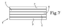 実際、その場合、バリア層Eは2つの遮断要素311、312それぞれのヘッドによって横方向に拘束されず、したがって、横断方向Zにおいて接着剤層Cと同じ長さを採用する。第2の狭窄手段32の遮断要素321、322が非作動のままである場合、ポリプロピレンPに対する接着剤-バリア-接着剤の3つの中央層コアにも同じことが当てはまる。  Indeed, in that case the barrier layer E is not constrained laterally by the heads of the two blocking