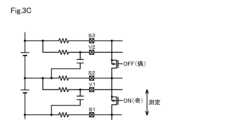 次に、奇数番目に並ぶ放電用スイッチ10だけをONさせる「放電用SW診断奇数」を行う。これが第3ステップに相当する。この時も、接続用スイッチ13,14のオンオフを順次切り替えて奇数番目に並ぶ電池セル2の電圧をそれぞれ検出し、検出結果を制御装置11内部の診断レジスタ(奇数)に格納する。対応する検出状態を図3Cに示す。それから、制御装置11は、通常レジスタ,診断レジスタに格納された各電圧値を比較して判定を行う。これらの「通常レジスタ読み出し」,「診断レジスタ読み出し」,「比較判定」が第4ステップに相当する。尚、「放電用SW診断偶数」と「放電用SW診断奇数」の順序を入れ替えても良いことは言うまでもない。  Next, the “discharge SW diagnosis odd number” is performed to turn ON only the discharge switches 10 arranged in the odd-numbered order. This corresponds to the third step. Also at this time, the connection switches 13 and 14 are sequentially turned on and off to detect the voltages of the odd-numbered
