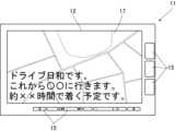 また、前記文字表示制御手段38により、文字表示に、通常表示モード,ナビゲーション画面縮小表示モード,割込み表示モードや時系列表示モードなどの複数のモードを選択可能であるから、好みのモードを選択することができる。さらに、ナビゲーション画面縮小表示モードを選択した場合、ディスプレイ部12において、表示されていたナビゲーション画面17を縮小し、この縮小によりディスプレイ部12の下部にナビゲーション画面17の非表示範囲52が設けられ、この非表示範囲52に前記通常表示モードと同様に運転者の話による文字言語を表示するから、ナビゲーション画面17の一部を非表示にすることなく、言語音声の内容を文字言語で表示することができる。  Further, the character display control means 38 can select a plurality of modes for character display, such as normal display mode, reduced navigation screen display mode, interrupt display mode, and chronological display mode. be able to. Further, when the reduced navigation screen display mode is selected, the