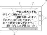 時系列表示モードの一例を図10に示す。尚、コミュニケーションの内容は前記通常表示モードの一例と同じである。同図に示すように、手話を変換した文字言語「今日は晴天ですね。」の音声出力の後、運転者の初めの話が、文字言語「ドライブ日和です。」としてディスプレイ部12の下部に表示される。これに対して手話を変換した文字言語「運転よろしくお願いします。」が音声出力され、運転者の次の話を変換した文字言語「これから○○に行きます。約××時間で着く予定です。」が、2行に渡ってディスプレイ部12の下部に表示され、初めの文字言語「ドライブ日和です。」が上に移動する。  An example of the time series display mode is shown in FIG. The content of communication is the same as the example of the normal display mode. As shown in the figure, after voice output of the character language converted into sign language, "Today is fine weather, isn't it?" to be displayed. In response to this, the character language converted into sign language, "Thank you for driving." is displayed on the lower part of the