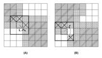 図3(A)、(B)のそれぞれに示した画像領域に対して上記の拡張処理を行った結果を、図4(A)、(B)に示す。図4(A)、(B)においてドットパターンで示している画素は、上記の拡張処理によって新たに被写体領域に含められた画素を示している。以下の説明で特に断らない限り、「被写体領域」とは、上記の拡張処理によって拡張された被写体領域のことを指すものとする。図4(A)、(B)の例では、斜線で示している画素(抽出部1030によって抽出された被写体領域を構成する画素)と、ドットパターンで示している画素(上記の拡張処理によって新たに被写体領域に含められた画素)と、で構成されている領域を被写体領域とする。なお、被写体領域を拡張するための方法には様々な方法があり、上記の方法に限らない。 FIGS. 4A and 4B show the results of performing the above expansion processing on the image regions shown in FIGS. 3A and 3B, respectively. Pixels shown in dot patterns in FIGS. 4(A) and 4(B) indicate pixels newly included in the subject area by the above expansion process. Unless otherwise specified in the following description, the "subject area" refers to the subject area expanded by the above expansion process. In the examples of FIGS. 4A and 4B, pixels shown with diagonal lines (pixels forming the subject area extracted by the extraction unit 1030) and pixels shown with dot patterns (new (pixels included in the subject area). Note that there are various methods for expanding the subject area, and the method is not limited to the above method.