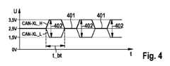 さらに、送信モジュール121は、データフェーズ452を含む第2の動作モードにおける信号CAN-XL_H、CAN-XL_Lの時間プロファイルのために、より高いビットレートでビットをバス40に送信する。CAN-XL_HおよびCAN-XL_L信号は、データフェーズ452でさらに、CAN  FDの場合とは異なる物理層を用いて生成することもできる。それにより、データフェーズ452でのビットレートは、CAN  FDの場合よりもさらに増加させることができる。  Furthermore, the transmitting