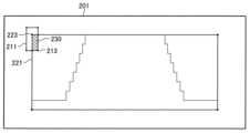 例えば、外部機器300から取得する加工工具210の加工可能な部分の表面形状を円柱として抽象化した場合、工具外形情報処理部102は、抽象化された円柱と第一切断面201との交線を第一工具外形線211として生成する。この場合、図5に示すように、第一工具外形線211は、矩形(正方形を含む)であり、工具外形情報処理部102は、矩形の頂点である第一工具外形点213の座標で示した矩形情報により構成される第一工具外形情報を生成する。  For example, when the surface shape of the machinable part of the