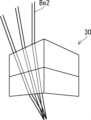図23及び図24は、導波路6の複数の放射位置から、様々な角度で、片方向(放射角度θの負方向(-θ))へ光を放射した場合のシミュレーション結果を示す。図23はプリズムレンズ30の斜視図であり、図24はプリズムレンズ30の側面図である。図23に示すように、様々な角度で光を放射した場合であっても、第2の設計例にかかるプリズムレンズ30を用いることで、出射ビームがコリメートされていることが分かる。また、図24で示すように、第2の設計例にかかるプリズムレンズ30を用いることで、矢印Be2で示す出射ビームが、真上方向(θ’=0)に出射されていることが分かる。  23 and 24 show simulation results when light is emitted from a plurality of emission positions of the