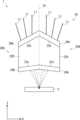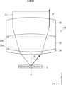 プリズムレンズ20は、プリズムレンズ本体22と、シリンドリカルレンズ24,26とを有する。プリズムレンズ本体22は、互いに平行でない対向する1組の面22a,22b(第1の面)を有する。ここで、プリズムレンズ本体22の下方(フォトニック結晶導波路2の側)の面が面22aであり、上方(フォトニック結晶導波路2の反対側)の面が面22bである。したがって、面22a,22bは、これらの一端から他端に向かって互いの間隔が短く又は長くなる、対向する1組の面である。例えば、図11において、左端から右端(X軸の正方向)に向かって、面22aと面22bとの間隔は短くなる。逆に、図9において、右端から左端(X軸の負方向)に向かって、面22aと面22bとの間隔は長くなる。プリズムレンズ20は、光の伝搬方向であるX軸方向について、面22a,面22bのX軸の正方向の側(光の入射方向の下流側)がフォトニック結晶導波路2に近づくように傾くように、設置されている。ここで、面22a及び面22bは、ZX平面に垂直であるとする。したがって、プリズムレンズ本体22は、側面方向(Y軸方向)から見た面(図10の矢印Aで示す)を底面とする四角柱であるといえる。しかしながら、プリズムレンズ本体22の形状は、四角柱であることに限定されない。また、プリズムレンズ本体22は、面22aと面22bとの距離が、X軸の正方向の側(光の入射方向の下流側)の方がX軸の負方向の側(光の入射方向の上流側)よりも近くなるように形成されている。  The