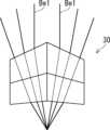 図20は、実施の形態2にかかるプリズムレンズ30の第2の設計例を示す図である。図20の左図はプリズムレンズ30の正面図であり、図20の右図はプリズムレンズ30の側面図である。なお、図19の例と同様に、図20においては、プリズムレンズ本体22Aとプリズムレンズ本体22Bとを区別しない。さらに、図20においては、プリズムレンズ本体22の面22a,22bは明示されていない。  FIG. 20 is a diagram showing a second design example of the