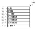 ユーザマスタ106は、企業グループ各社のシステムで利用可能な共通IDを割り当てられているユーザの情報を格納する。図3は、本発明の実施形態に係るユーザマスタ106のデータ構造の一例を示す図である。ユーザマスタ106は、共通ID301、認証情報302、ユーザ情報303、第1の加算フラグ304、第2の加算フラグ305、第Nの加算フラグ306、及び共通ポイント307を含むことができるが、これらのデータ項目に限定されることはなく他のデータ項目も含むことができる。例えば、後述するように、ユーザマスタ106は、グループ各社のシステムを利用する際のそれぞれの個別IDを有するように構成されていてもよい。この場合、ユーザマスタ106は、グループ会社の数だけ個別IDを有することができる。  The
