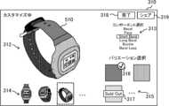 ユーザは、カスタマイズ用画面で、カスタマイズしたいコンポーネントについてバリエーションを選択して、腕時計をカスタマイズすることができる。そして、カスタマイズが完了したら、完了ボタン318を押すことにより、カスタマイズを終了することができる。また、ユーザはシェアボタン319を押すことにより、カスタマイズしたモデルの画像に関する情報をSNS(Social  Networking  Service)等に投稿することができる。  The user can customize the wristwatch by selecting a variation of the component he/she wants to customize on the customization screen. When the customization is completed, the customization can be ended by pressing the