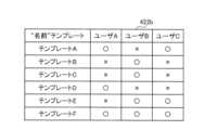 図4は、テンプレート毎に使用できるユーザが制限されている場合のテーブルデータ422bの一例を示している。図4には、“名前”テンプレートT1に属するテンプレートとして、テンプレートA~Fの6種類が例示されている。例えば、テンプレートAは、ユーザAとユーザCは使用できるが、ユーザBは使用できない。このようなテーブルデータ422bは、例えば、アプリケーションサーバ400のデータ記憶領域422に記憶されている。  FIG. 4 shows an example of