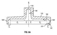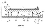 [0050]リッドプレート170の輪郭底面160とガス分配プレート125の上面128とは、間隙Gを画定する。底面160は輪郭形成されるため、間隙Gは、中心軸133からの距離の関数として可変である。いくつかの実施態様では、内側ゾーンZIは、中間ゾーンZMよりも大きな間隙を有し、中間ゾーンZMは、外側ゾーンZOよりも大きな間隙を有する。図6Aは、図5に示されるものと同様の輪郭底面160を有するリッドプレート170の概略断面図を示す。図6Bは、図5のリッドプレート170およびガス分配プレート125の概略断面図であり、中心軸133からの半径方向距離に対する空隙Gの関係を示している。図6Aでは、リッドプレート170の輪郭底面160は、内側ゾーンZI、中間ゾーンZM、および外側ゾーンZOの3つのゾーンに分離されている。この実施態様では、中間ゾーンZMにおいて、輪郭底面160は、間隙GMが均一になるように平坦である。図6Bの部分断面図では、中間ゾーンZMの間隙GMは、中間ゾーンZMの左エッジから右エッジまで均一である。内側ゾーンZIにおいて、間隙GIは、中心軸133から測定される距離xの関数である。図6Bには、内側ゾーンZIにおける間隙GIdxの2つの測定値が示されている。外側ゾーンZOでは、間隙GOは、中心軸133から測定される距離xの関数である。図6Bには、外側ゾーンZOの間隙GOdxの1つの測定値が示されている。当業者であれば、図示の測定値が説明のみを目的としていることが分かるであろう。図6Bでは、ガス分配プレート125の開孔126が説明上省略されている。[0050] The contoured