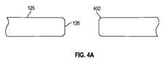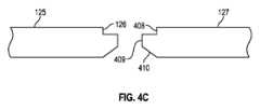 [0031]複数の開孔126は、円筒状の貫通孔として示されているが、異なるプロファイルを有してもよい。図4A~Cは、複数の開孔126のプロファイルの異なる非限定的実施態様を示す。図4Aに示される実施態様では、開孔126は、開孔を囲む湾曲したエッジ402を有する円筒状の貫通孔である。図4Bに示される実施態様では、開孔126は、開孔の中心に向かって内側にテーパ付けされている上部404と、ガス分配プレート125の上面127に対して垂直に延びる円筒状の中心部405と、開孔の中心から外側に向かってテーパ付けされている下部406とを有する貫通孔である。図4Cに示す実施態様では、開孔126は、皿穴を有する上部408と、ガス分配プレート125の上面127に対して垂直に延びる円筒状の中心部409と、開孔の中心から外側に向かってテーパ付けされている下部410とを有する貫通孔である。代替的に、複数の開孔126の他のプロファイルを使用して、基板110の処理中に最適な堆積均一性を達成してもよい。  [0031] Although the plurality of