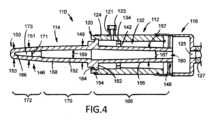 図示の実施形態において、第1キャップ114’は、ストレージ部材又はローディング部材の第1端部に解放可能に装着され得る装置ガード146’を含む。装置ガード146’は、長手方向軸147’と、第1端部148’と、第2端部150’と、ベース154’、第1突起156’、凹部160’、第1突起161’及び第2突起163’を画定する本体152’とを有する。ベース154’は、第1端部148’から第2端部150’に向かって延在し、且つストレージ部材のパセッジウェイ内に解放可能に装着されるようにサイズ設定及び構成されている。図示の実施形態において、ベース154’は、外径155’と、第1側部162’と、第2側部164’とを有し、且つ装置ガード146’とストレージ部材との間でスナップフィット装着を使用することにより、パセッジウェイ内でストレージ部材に解放可能に装着されるようにサイズ設定及び構成されている。  In the illustrated embodiment, the first cap 114' includes a device guard 146' that may be releasably attached to the first end of the storage or loading member. The device guard 146' has a longitudinal axis 147', a first end 148', a second end 150', a base 154', a first protrusion 156', a recess 160', a first protrusion 161' and a