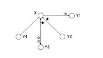 図10は、ユーザとその関連ユーザとの間で、コンテンツのプレゼントがなされた状況を示した模式図である。矢印線は、ユーザから矢印の方向のユーザに対してコンテンツがプレゼントされたことを示しており、白抜きの星がユーザXから関連ユーザに対してプレゼントされたコンテンツを示し、黒色の星が関連ユーザからユーザXに対してプレゼントされたコンテンツを示している。図10では、一定期間の間に、ユーザXからユーザY1に対して、コンテンツが1個プレゼントされたことを示している。また、ユーザY2からユーザXに対して、コンテンツが1個プレゼントされたことが示されている。また、ユーザXからユーザY3に対してはコンテンツが2個プレゼントされ、ユーザY3からユーザXに対してはコンテンツが1個プレゼントされている。なお、ユーザXとユーザY4との間には、コンテンツプレゼント情報が存在しない。 FIG. 10 is a schematic diagram showing a situation in which content is presented as a gift between a user and its related users. The arrow line indicates that the content was presented by the user to the user in the direction of the arrow, the white star indicates the content that was presented from User X to the related user, and the black star indicates the related user. The content presented to user X by the user is shown. FIG. 10 shows that one piece of content was presented from user X to user Y1 during a certain period of time. It is also shown that one piece of content was presented to user X from user Y2. Further, user X presents two pieces of content to user Y3, and user Y3 presents one piece of content to user X. Note that there is no content present information between user X and user Y4.