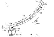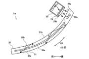 第1導光体30は、第1方向に沿って延びる導光体10であり、横方向から見た場合の断面形状が、円弧状である。第1導光体30は、第2導光体40と重ね合わさるように、第2導光体40に固定される。第1導光体30は、長さ方向の一端側が画像光出射部20の出射面部29と対向するように配置される。第1導光体30は、画像光出射部20側に位置する裏面30aと、裏面30aに背向しかつ第2導光体40側に位置する表面30bとを有している。第1導光体30の厚みは一定であり、第1導光体30の裏面30aの曲率半径は、表面30bの曲率半径よりも大きい。つまり、第1導光体30は、横から見た場合に、画像光出射部20に対して凸状に、フロントウインド3に対して凹状に湾曲している。  The