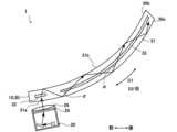 第2導光体40は、第1方向D1及び第2方向D2に沿って延びる導光体10であり、横方向から見た場合の断面形状が円弧状である。第2導光体40は、第1導光体30と重ね合わさるように、第1導光体30を固定する。第2導光体40は、長さ方向の一端側が第1導光体30と対向するように配置される。第2導光体40は、第1導光体30側に位置する裏面40aと、裏面40aに背向しかつフロントウインド3側に位置する表面40bとを有している。第2導光体40の厚みは一定であり、第2導光体40の裏面40aの曲率半径は、表面40bの曲率半径よりも大きい。  The second