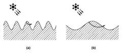 法線ベクトルの向きの変化は図4に示すように斜面の傾きに依存する。図7(b)に示すように、最大値hが小さく傾きが小さい場合、法線ベクトルの向きは、平面に垂直な向き(図7(b)の破線矢印)に近い分布を示す。一方、最大値hが大きく、傾きが大きい場合、法線ベクトルの向きは、より分散した分布を示す。従って、長波長光ほど、最大値hを小さく設定して法線ベクトルの向きの変化を小さくし、短波長光ほど、最大値hを大きく設定して法線ベクトルの向きの変化を大きくすることができる。言い替えれば、波長λに対して高さの最大値hの差を与えることで、後述する画素値の計算処理において(内部散乱光がない場合はシャドウ部である)FIOSの明度上昇を得る。 Changes in the direction of the normal vector depend on the inclination of the slope, as shown in Figure 4. As shown in FIG. 7(b), when the maximum value h is small and the slope is small, the direction of the normal vector exhibits a distribution close to the direction perpendicular to the plane (dashed line arrow in FIG. 7(b)). On the other hand, when the maximum value h is large and the slope is large, the direction of the normal vector shows a more dispersed distribution. Therefore, the longer the wavelength of light, the smaller the maximum value h is set to reduce the change in the direction of the normal vector, and the shorter the wavelength light, the larger the maximum value h is set to make the change in the normal vector direction larger. Can be done. In other words, by giving a difference in the maximum height value h to the wavelength λ, the brightness of the FIOS (which is a shadow part when there is no internally scattered light) is obtained in the pixel value calculation process described later.