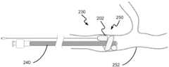 図9~図11は、医療手技の間の螺旋状バルーン補助装置100の基本的な動作を示す。図9は、臨床医によって患者の脈管構造252内の治療部位250に既に配置されていてよいカテーテル240上の近位位置230に完全に取り付けられた螺旋状バルーン補助装置100を示す。次いで、膨張管104又は別のポジショナー(図示せず)を使用して螺旋状バルーン補助装置100をカテーテル240に沿って治療部位250に摺動させる。図10は、治療部位250においてカテーテル240上の遠位位置232に取り付けられた螺旋状バルーン補助装置100を示す。次いで、図11に示されるように、バルーン202を膨張管104を使用して膨張させて、患者の血管構造252の一部を閉塞する。いくつかの例では、螺旋状バルーン補助装置100を臨床手技の間に使用して、血流を閉塞するか、処置によって遊離した組織、血栓、若しくは破片を閉塞又は捕捉するか、又は血管内の定位置にカテーテル240を保持することができる。  9-11 illustrate the basic operation of the helical balloon assist