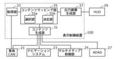 本実施の形態においては、コンテンツ生成部31は、例えば、車両CANから車両101の操作に関する各種機構の制御情報を取得してもよい。また、コンテンツ生成部31は、例えば、ナビゲーションシステム23から、車両101の誘導に関する情報を取得してもよい。また、コンテンツ生成部31は、例えば、マルチメディア制御部25から、車両101内において視聴されるマルチメディアに関する情報を取得してもよい。また、コンテンツ生成部31は、例えば、ADAS27から、安全な操作のためのドライバのサポートに関する情報を取得してもよい。また、コンテンツ生成部31は、他の図示しない周辺装置からユーザに視認させるための画像を生成する情報を取得してもよい。  In the present embodiment, the