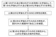 工程(4)の一態様としては、例えば、工程(2)の第2のガラスの応力特性の測定結果を元に工程(1)の化学強化条件を同定し、予め設定した「第1のガラスの化学強化条件についての設計された範囲」と比較し、工程(1)の化学強化条件が該設計された範囲内であるか否かを判断する。 As one aspect of step (4), for example, the chemical strengthening conditions of step (1) are identified based on the measurement results of the stress characteristics of the second glass of step (2), and the preset "first glass" The chemical strengthening conditions of step (1) are compared with the designed range of the chemical strengthening conditions of step (1) to determine whether the chemical strengthening conditions of step (1) are within the designed range.