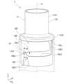 霧化容器24は、弾性を有する部材、例えばシリコーン樹脂等の樹脂材料により形成されている。霧化容器24は、有底筒状に形成されている。霧化容器24の周壁24aの上端開口縁は、主軸方向でメッシュ体23の外周縁に接している。つまり、メッシュ体23は、ガスケット22と霧化容器24との間に挟まれている。霧化容器24の周壁24aの外面には、タンク21の外周壁21dの内面に嵌合する嵌合部24bが形成されている。  Theatomization container 24 is made of an elastic member, such as a resin material such as silicone resin. Theatomization container 24 is formed into a cylindrical shape with a bottom. The upper opening edge of theperipheral wall 24a of theatomization container 24 is in contact with the outer peripheral edge of themesh body 23 in the main axis direction. That is, themesh body 23 is sandwiched between thegasket 22 and theatomization container 24. Afitting portion 24b that fits into the inner surface of the outercircumferential wall 21d of thetank 21 is formed on the outer surface of thecircumferential wall 24a of theatomization container 24.