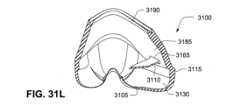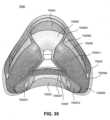 実施例において、(a)密閉構造は第2の内面領域を含み得、第2の内面領域は、第1の内面領域から間隔を空けて配置され、(b)プレナムチャンバは第2の内面領域を含み得、第2の内面領域は、第1の内面領域から間隔を空けて配置され、(c)つなぎ材および密閉構造は、均質材料から形成された一体構造を含み得、(d)均質材料はシリコーンゴムであり得、(e)シリコーンゴムは、液体シリコーンゴムまたは圧縮成型シリコーンゴムであり得、(f)密閉構造は、密閉フラップを縁領域において含み得、密閉フラップは、使用時に患者の鼻の側部を少なくとも密閉するような形状および配置にされ、密閉フラップは、密閉構造の隣接領域よりも肉薄であり、(g)第1の内面領域は、つなぎ材が密閉フラップから内方に間隔を空けて配置されるように密閉フラップに隣接し得、(h)つなぎ材は、つなぎ材が密閉面の延長部分を形成するように、縁領域において近接して密閉構造から延び得、(i)つなぎ材は内面を含み得、密閉構造は内面を含み得、(j)つなぎ材の内面は、密閉構造の内面に隣接しかつ密閉構造の内面にから分離され、(k)プレナムチャンバは、透明材料から構成され得、(l)患者インターフェースは、使用時に患者インターフェース構造のいずれの部分も口腔に進入しないように構成され得、(m)密閉構造は、使用時に患者の気道内に延びないように構成され得、(n)密閉構造は、使用時にオトガイ隆起領域の下側に延びないように構成され得、および/または(o)プレナムチャンバは、使用時に眼を被覆しないように構成され得る。 In embodiments, (a) the sealing structure may include a second interior surface region, the second interior surface region being spaced apart from the first interior surface region, and (b) the plenum chamber comprising the second interior surface region. (c) the tie and closure structure can include a unitary structure formed from a homogeneous material; (d) the second interior surface region is spaced apart from the first interior surface region; The material may be a silicone rubber; (e) the silicone rubber may be a liquid silicone rubber or a compression molded silicone rubber; and (f) the sealing structure may include a sealing flap in the edge region, the sealing flap being in contact with the patient during use. (g) the first inner surface area is shaped and arranged to seal at least the side of the nose of the sealing flap, the sealing flap being thinner than an adjacent region of the sealing structure; (h) the tether may extend from the closure structure in close proximity at the edge region such that the tether forms an extension of the closure surface; (i) the tie may include an inner surface, and the sealed structure may include an inner surface; (j) the inner surface of the tie is adjacent to and separated from the inner surface of the sealed structure; and (k) the plenum chamber (l) the patient interface may be configured such that no portion of the patient interface structure enters the oral cavity during use; and (m) the sealing structure may be configured such that no portion of the patient interface structure enters the patient's airway during use. (n) the sealing structure may be configured such that it does not extend below the mental ridge area in use, and/or (o) the plenum chamber does not cover the eye in use. can be configured.