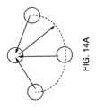多数の個別ピクセルからの電気信号出力が同時に収集される場合、一を超えるデータストリームを、一つの検出器アレイから同時に受信することができる。図13は、4つの通信ノード1300A、1300B、1300C及び1300Dが互いに通信するように構成された多ビームFSO通信システムを示す。ノード1300Aは、多数のノード1300B及び1300Cからのビームを、この例では同時に受信している。一般に、任意数の通信ノードを、各通信ノードが任意の他の通信ノードからデータを送受信することができるメッシュネットワークにおいて通信するように配列することができる。この例において、各通信ノードは、一つの送信側ポートを有する一方、検出器アレイにおいて同時に検出され得る多数の強度パターンに対応する多数の受信器側ポートを有する。よって、図14A~図14Dに示されるような様々なメッシュネットワーク構成が可能である。ここで、矢印は、異なる通信ノード(丸で表す)間のFSOリンクを介したデータ送信を示す。他例において、各通信ノードは、多数の送信器側ポートを含み得る。例えば、多数の送信器側開口から多数のビームを送信することにより、潜在的に複雑かつ柔軟なメッシュネットワーク構成がもたらされる。 If electrical signal outputs from multiple individual pixels are collected simultaneously, more than one data stream can be received from one detector array simultaneously. FIG. 13 shows a multi-beam FSO communication system in which four communication nodes 1300A, 1300B, 1300C and 1300D are configured to communicate with each other. Node 1300A is receiving beams from multiple nodes 1300B and 1300C simultaneously in this example. In general, any number of communication nodes can be arranged to communicate in a mesh network in which each communication node can send and receive data from any other communication node. In this example, each communication node has one transmitter port while having multiple receiver ports corresponding to multiple intensity patterns that can be simultaneously detected in the detector array. Accordingly, various mesh network configurations such as those shown in FIGS. 14A-14D are possible. Here, arrows indicate data transmission over FSO links between different communicating nodes (represented by circles). In other examples, each communication node may include multiple transmitter-side ports. For example, transmitting multiple beams from multiple transmitter side apertures results in potentially complex and flexible mesh network configurations.