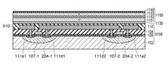 図4の上部には、第I層の平面図が模式的に表示され、下部には、第II層の平面図が模式的に表示されている。図4では、第I層を“I”と表記し、第II層を“II”と表記している。第I層は、発光素子22(150)が形成された層である。すなわち、第I層は、図1において、第2の配線層130からZ軸の正方向に、第3の配線層160までの層を含んでいる。図4では、第2の層間絶縁膜156は示されていない。第II層は、図1において、基板102からZ軸の正方向に、第1の層間絶縁膜112までの層を含んでいる。図4では、基板102、絶縁層105、絶縁膜108および第1の層間絶縁膜112は示されていない。この図では、素子形成領域104としてチャネル領域104cが示されている。  In the upper part of FIG. 4, a plan view of the I-th layer is schematically displayed, and in the lower part, the plan view of the II-th layer is schematically displayed. In FIG. 4, the I-th layer is expressed as "I" and theII-th layer is expressed as "II". The I-th layer is a layer in which the light emitting element 22 (150) is formed. That is, the I-th layer includes layers from the