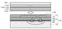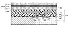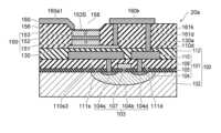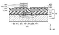 トランジスタ103は、基板102に形成されている。基板102には、発光素子150の駆動用のトランジスタ103のほか、他のトランジスタやキャパシタ等の回路素子が形成され、配線等によって回路101を構成している。たとえば、トランジスタ103は、後述する図3に示された駆動トランジスタ26に対応し、そのほか選択トランジスタ24やキャパシタ28等が回路素子である。以下では、回路101は、回路素子が形成された素子形成領域104、絶縁層105、配線層110、配線層110と回路素子を接続するビアおよび回路素子間等を絶縁する絶縁膜108を含むものとする。基板102、回路101および層間絶縁膜112等のその他の構成要素を含めて回路基板100と呼ぶことがある。