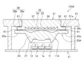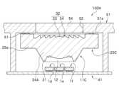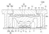また、第1レンズ11は、基板41の上面と第1脚領域25bの下面とが接着部材61を介して固定される。なお、第2レンズ31Eは、第1レンズ11と所定の間隔を隔てて配置できるように、筐体下面51aに接着部材61により接続させている。また、第1レンズ11及び第2レンズ31Eは、それぞれの光軸中心が、透明部材54の中心に揃うように配置されることが好ましい。