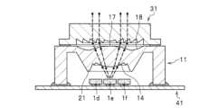 例えば、図7Aに示すように、平面視で矩形形状に配置された複数の発光装置のうち、矩形の中心部に配置された1つの発光装置1eが点灯した際には、図7Bに示すように、主に第1レンズ11の下面凸部14を通過する光が、上面凸部17及び第2レンズ31で屈折されて、所定の照射範囲の矩形中心部に照射される。なお、図7Cに、矩形中心部に配置された発光素子点灯時の照度分布を示す。また、図8Aに示すように、複数の発光装置のうち、矩形の角部を除く端部に配置された1つの発光装置1bが点灯した際には、図8Bに示すように、主に第1レンズ11の下面凸部14及び導光部21を通過する光が、上面凸部17、上面凹部18及び第2レンズ31で屈折されて、所定の照射範囲の角部を除く矩形端部に照射される。なお、図8Cに、角部を除く矩形端部に配置された発光素子点灯時の照度分布を示す。さらに、図9Aに示すように、複数の発光装置のうち、矩形の角部に配置された1つの発光装置1cが点灯した際には、図9Bに示すように、主に第1レンズ11の下面凸部14及び導光部21を通過する光が、上面凸部17、上面凹部18及び第2レンズ31で屈折されて、所定の照射範囲の矩形角部に照射される。なお、図9Cに、矩形角部に配置された発光素子点灯時の照度分布を示す。