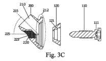 一実施形態では、第1の縦軸は、第1の貫通導管の軸方向の対称軸と一致する。前述の実施形態のいずれかと両立する別の実施形態では、第2の締結導管は、第1の締結要素を収容および締結するように構成されている。前述の実施形態のいずれかと両立する別の実施形態では、第2の締結導管は、第2の縦軸に沿って延在する。In one embodiment, the first longitudinal axis coincides with an axial axis of symmetry of the first through conduit. In another embodiment compatible with any of the aforementioned embodiments, the second fastening conduit is configured to receive and fasten the first fastening element. In another embodiment compatible with any of the aforementioned embodiments, the second fastening conduit extends along the second longitudinal axis.
