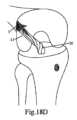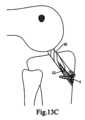 したがって、単一の脛骨骨孔を用いる3本鎖構成では、移植片は2つのループ、脛骨ループおよび大腿骨ループで構成され、これらは、大腿骨締結装置によって締結された脛骨穴から来る移植片の自由端と、脛骨締結装置によって締結された大腿骨穴から来る移植片の自由端とを用いて、それぞれの脛骨および大腿骨締結装置のそれぞれの穴から吊られている。Thus, in a three-strand configuration using a single tibial hole, the graft is composed of two loops, a tibial loop and a femoral loop, which are suspended from respective holes in the respective tibial and femoral fasteners, with the free end of the graft coming from the tibial hole fastened by the femoral fastener and the free end of the graft coming from the femoral hole fastened by the tibial fastener.