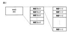図2に示すように、NANDメモリダイは、各々が複数の物理ページを含む複数の物理ブロックを含む。以下、単に「ページ」とある場合は、物理ページを示す。データの書き込みおよびデータの読み出しは、ページ単位で処理される。一方、データの消去は、物理ブロック単位で処理される。データを書き込み済みのページへのデータの上書きは行われない。そのため、データの更新は、あるページ上の元のデータを無効化し、新たなデータを他のページへ書き込むことによって行われる。よって、ある物理ブロックが、その大部分が不要となったデータ(無効なデータ)で占められるという状態が発生し得る。物理ブロックにおいて不良ページを除くデータを記憶可能な有効領域に占める有効なデータの割合は、有効クラスタ率などと称される。また、主に、この有効クラスタ率の小さい物理ブロックを対象として、不要となったデータが残存する領域を再利用するための処理は、ガベッジコレクション又はコンパクションなどと称される。ガベッジコレクションの詳細については後述する。As shown in FIG. 2, the NAND memory die includes multiple physical blocks, each of which includes multiple physical pages. Hereinafter, the term "page" refers to a physical page. Data writing and data reading are processed on a page-by-page basis. On the other hand, data erasure is processed on a physical block-by-physical block basis. Data is not overwritten on a page to which data has already been written. Therefore, data is updated by invalidating the original data on a page and writing new data to another page. Therefore, a state may occur in which a large part of a physical block is occupied by unnecessary data (invalid data). The ratio of valid data to the effective area in a physical block that can store data excluding defective pages is called the effective cluster ratio. The process of reusing the area in which unnecessary data remains, mainly targeting physical blocks with a small effective cluster ratio, is called garbage collection or compaction. Garbage collection will be described in detail later.