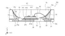 図4に例示する構成において、第1リード21の上面21aは、溝部21gを有しており、樹脂体30の材料の一部は、この溝部21g内に位置している。図4は、樹脂体30のうち第1リード21の溝部21gの内部に位置する部分が、樹脂体30の第3樹脂部33の材料と同一の材料から形成された例を示している。この例のように、第1リード21の上面21aに設けた溝部21g内に樹脂体30の材料の一部を配置し、その少なくとも一部が溝部21gと重なるように第3樹脂部33を形成することが好ましい。第3樹脂部33が溝部21gと重なる部分を含むことにより、第1リード21の上面21aに直接に第3樹脂部33を形成した場合と比較して、第1リード21から第3樹脂部33が剥離してしまうおそれを低減できる。図4に例示するように、樹脂体30のうち第1リード21の溝部21gの内部に位置する部分の幅は、典型的には、その部分の直上に位置する第3樹脂部33の幅よりも大きい。第3樹脂部33の幅と比較して樹脂体30のうち第1リード21の溝部21gの内部に位置する部分の幅を大きくすることにより、樹脂体30と第1リード21との間の界面の面積を大きくすることができるので、第1リード21からの第3樹脂部33の剥離をより効果的に抑制し得る。In the configuration illustrated in FIG. 4, theupper surface 21a of thefirst lead 21 has agroove 21g, and a part of the material of theresin body 30 is located in thisgroove 21g. FIG. 4 shows an example in which the part of theresin body 30 located inside thegroove 21g of thefirst lead 21 is formed from the same material as the material of thethird resin part 33 of theresin body 30. As in this example, it is preferable to place a part of the material of theresin body 30 in thegroove 21g provided on theupper surface 21a of thefirst lead 21, and form thethird resin part 33 so that at least a part of it overlaps with thegroove 21g. By including a part of thethird resin part 33 that overlaps with thegroove 21g, the risk of thethird resin part 33 peeling off from thefirst lead 21 can be reduced compared to the case in which thethird resin part 33 is formed directly on theupper surface 21a of thefirst lead 21. As shown in FIG. 4, the width of the portion of theresin body 30 located inside thegroove 21g of thefirst lead 21 is typically larger than the width of thethird resin portion 33 located directly above that portion. By making the width of the portion of theresin body 30 located inside thegroove 21g of thefirst lead 21 larger than the width of thethird resin portion 33, the area of the interface between theresin body 30 and thefirst lead 21 can be increased, and peeling of thethird resin portion 33 from thefirst lead 21 can be more effectively suppressed.