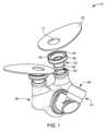 図1に示されるように、例えば、ポスト20は、強磁性ドーム形状リング62とマグネット50との間の接触を介して、シート25の強磁性ドーム形状リング62に向かって延伸して接触する、鼻プロング(prong)として構成される。シート25は、着用者の鼻孔に取り付けられるように構成され、吸気口38において受け入れられた流体は、シート25のそれぞれの開口部17を介して着用者の鼻孔に送達される。強磁性ドーム形状リング62は、シート25の一体化した構成要素であり、強磁性ドーム形状リング62の開口部は、シート25の各開口部17と位置合わせされる。1, for example, the